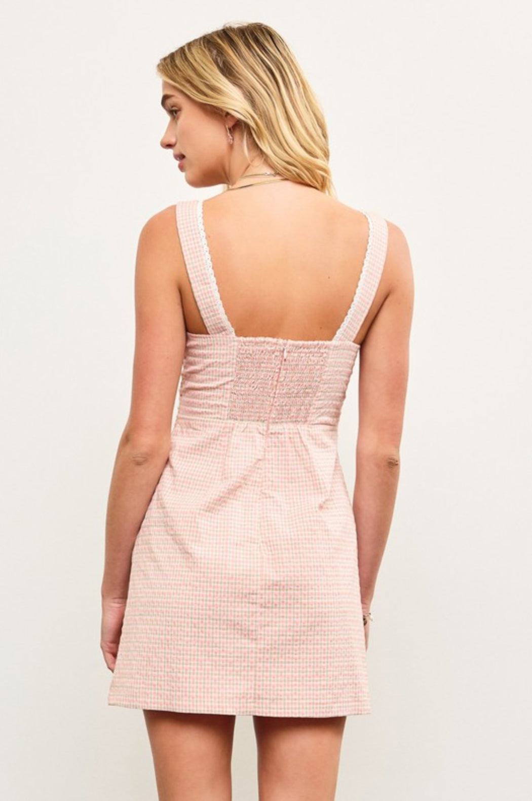 "Introducing the Destiny Mini Dress: a stylish and sophisticated addition to your wardrobe. Featuring a beautiful pink and tan plaid pattern, this mini dress boasts a flattering v neckline and elegant lace design, making it perfect for any occasion. Enhance your style with this must-have piece."