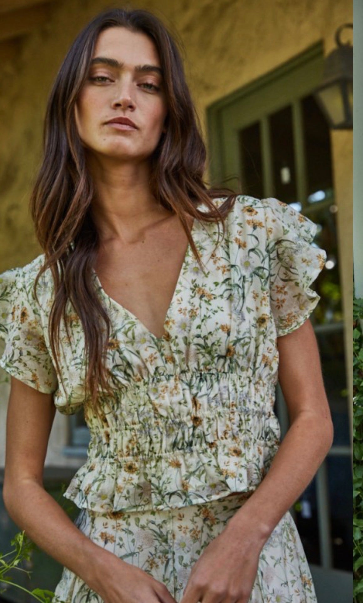 The Mia Crop Top features a V-neck design and flutter sleeves in a fully lined construction, offering both style and comfort. The floral pattern in ivory and green enhances its visual appeal. Pair it with the matching Mia Midi Skirt for a coordinated look, suitable for various occasions.