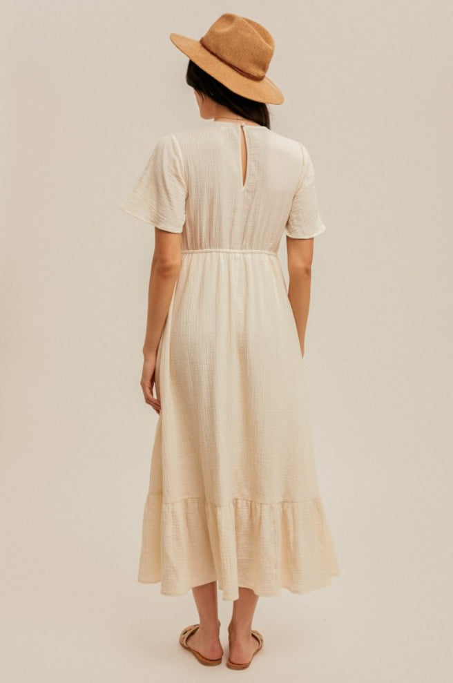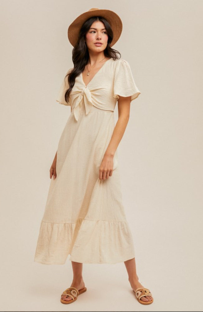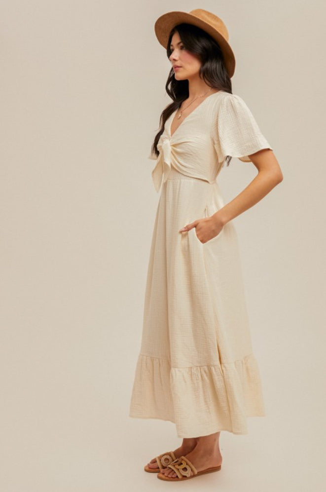 This butter cream colored midi dress features a bust knot and is made of cotton gauze for a breezy and comfortable fit. Perfect for a casual day out, this dress adds a touch of elegance to your wardrobe. Crafted to flatter any figure and provide all-day comfort, this dress is a must-have in any fashionista's collection.