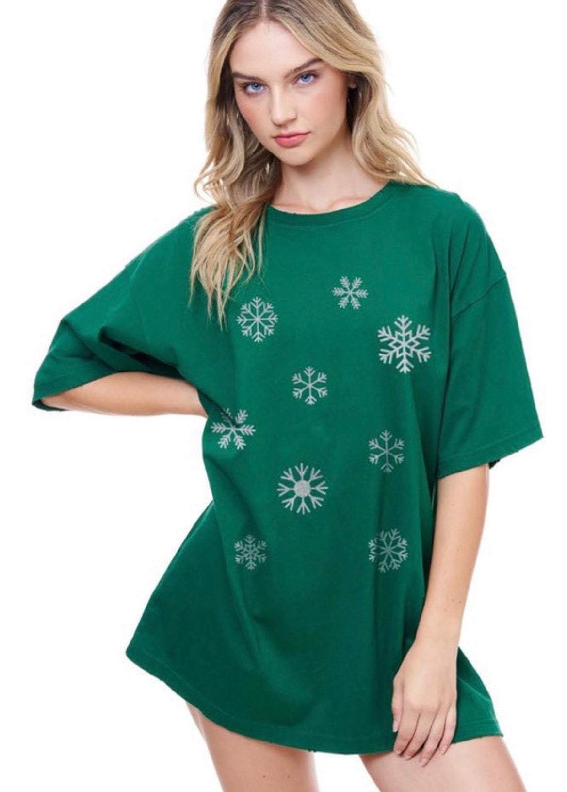 This oversized metallic snowflake graphic tee is perfect for lounging around, wear with leggings and your favorite “slipper shoes”.