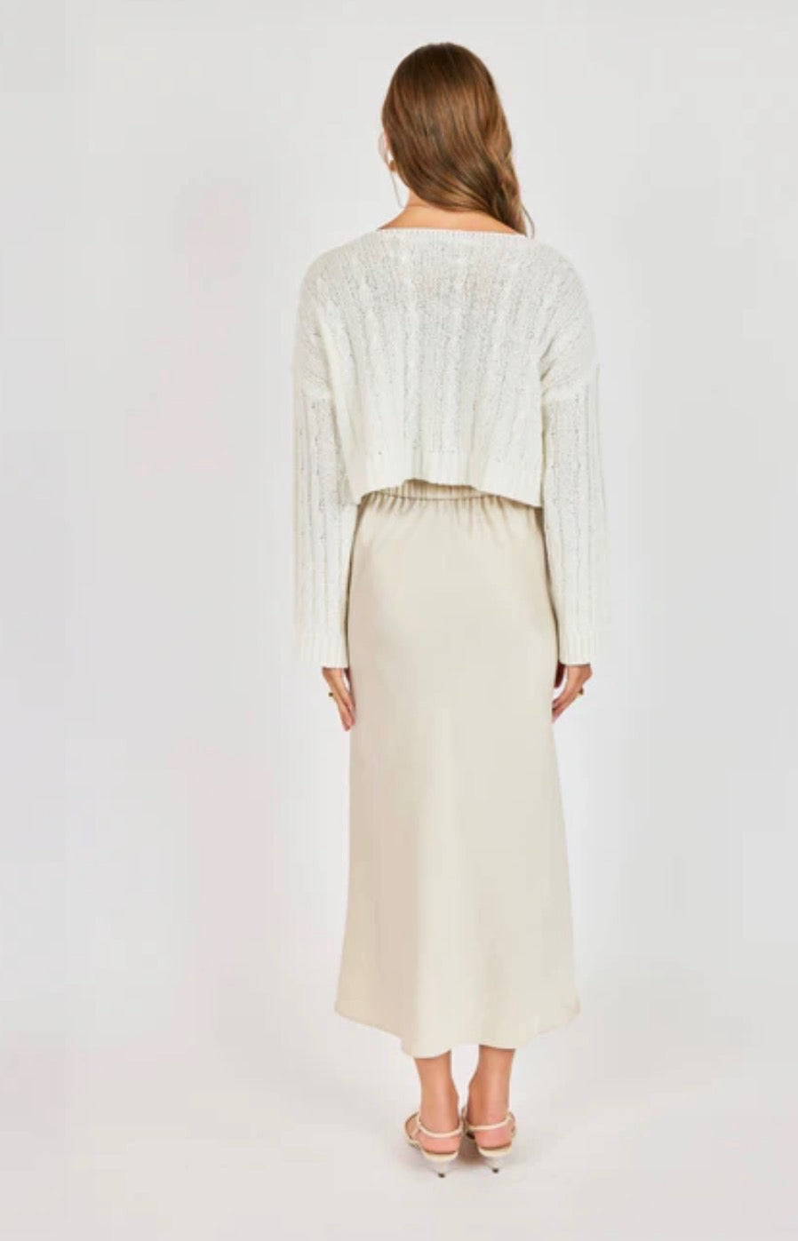The Sophia Cardigan is a cropped design featuring three buttons, crafted from a premium cream knit fabric. This cardigan provides versatile layering options, suitable for various occasions. Its structured yet soft composition ensures comfort while maintaining a polished appearance, offering both functionality and style for everyday wear.