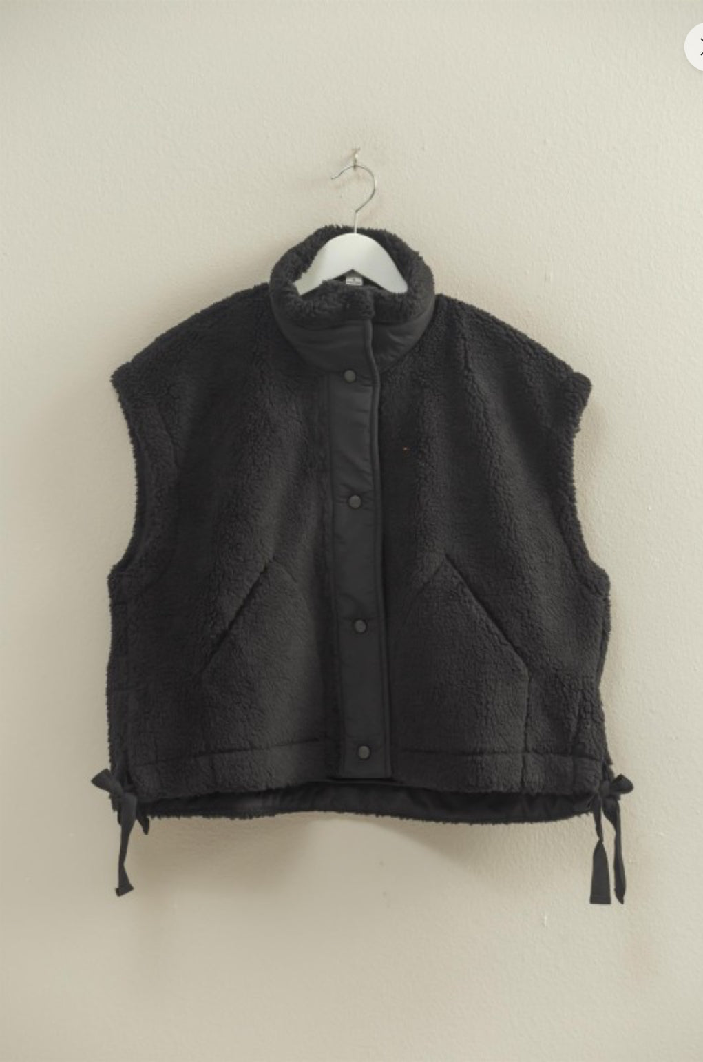 Expertly crafted for warmth and style, this Aspen black sherpa vest features a snap button placket down the front for easy wear and an oversized cut for a comfortable fit. Complete the look with a chic cap sleeve effect. Stay cozy while looking effortlessly fashionable.